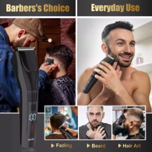 • 【High-Tech Efficiency】Rechargeable barber clipper for hair cutting is designed for the modern man. With an advanced LED display and TYPE-C charging, you’re always informed and powered up. The robust 800mAh battery ensures a solid 1.5-hour performance from just a two-hour charge. And with the handy travel lock feature, you’re assured that your clipper remains off and safe while in transit.